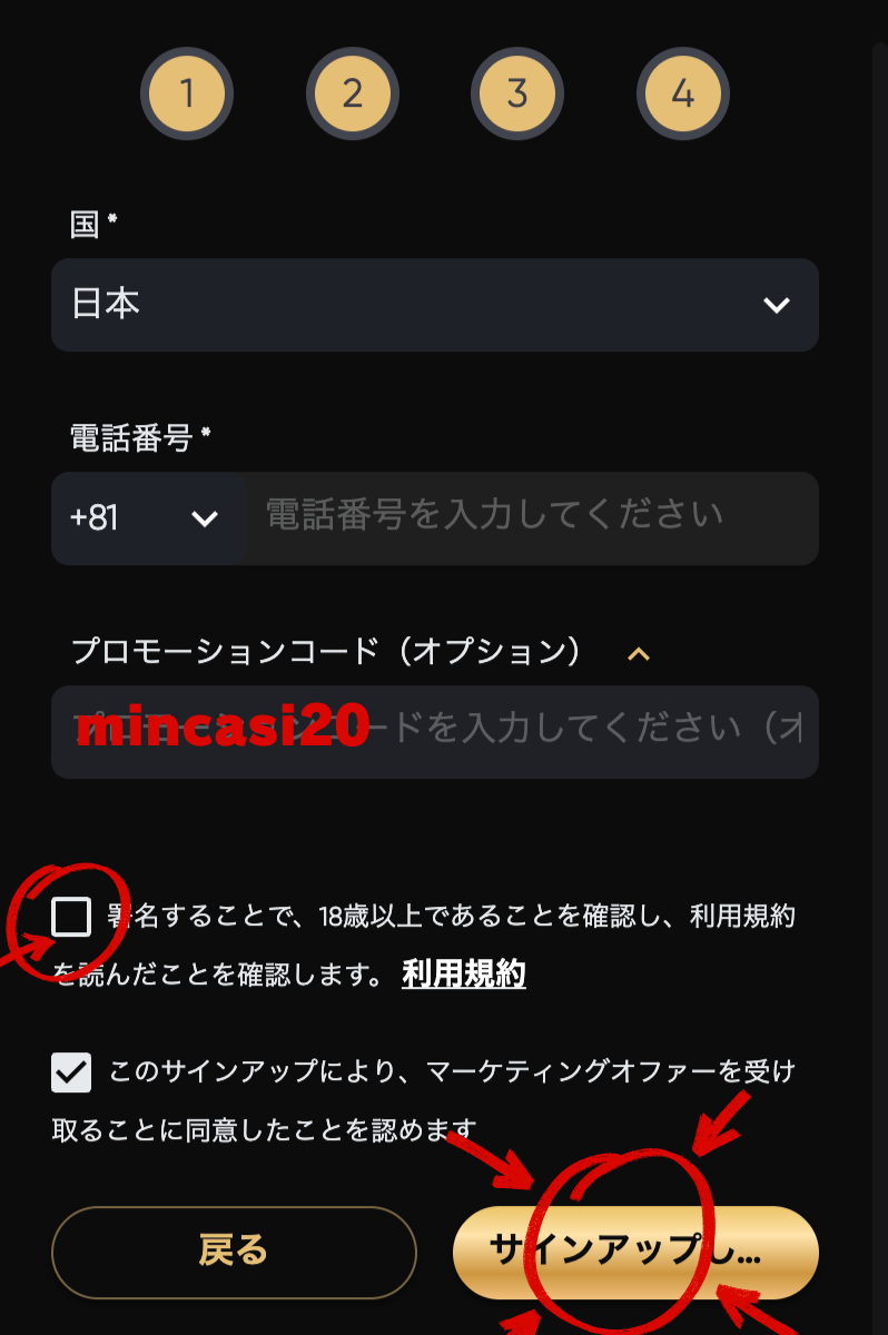 当サイトから登録して、プロモーションコード「mincasi20」を記入するだけで簡単にボーナスがゲットできます。