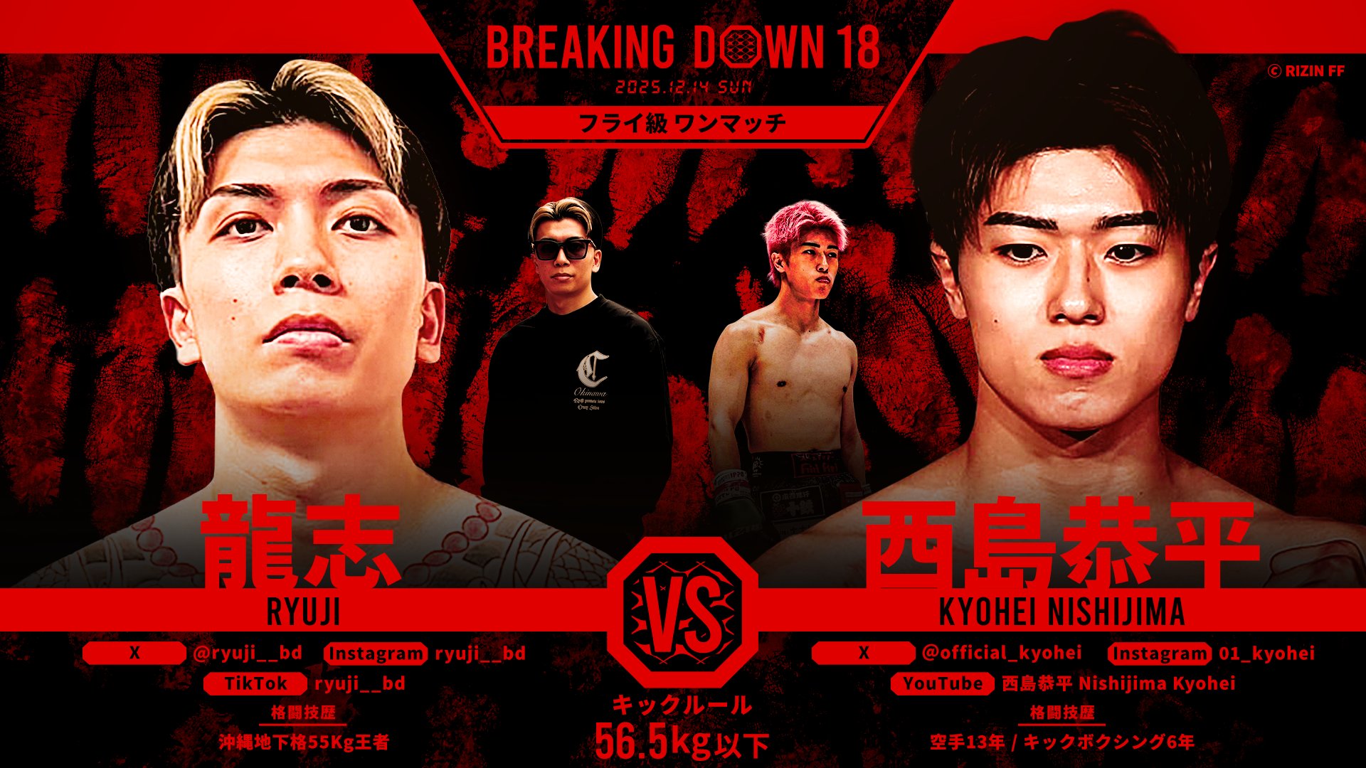 空手ベースのチン凸の天才・西島恭平が登場。対する龍志も軽量級の実力者。西島の華麗な足技とカウンターが炸裂するか、龍志がインファイトで潰しに行くか。高度な技術戦が期待されるカードです。