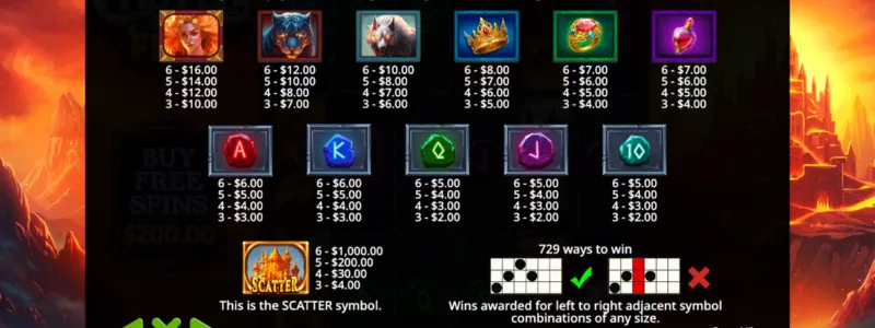 丘の上にそびえ立つ巨大な城と燃え盛る炎を背景に、火の王国の世界観を見事に表現したスロットゲームとなっています。スリリングな火の王国の世界へとプレイヤーを誘います。