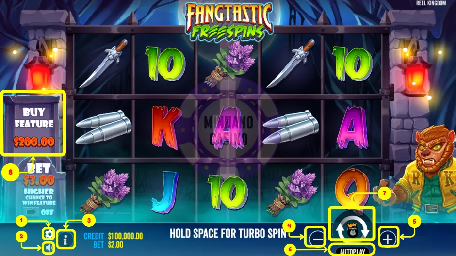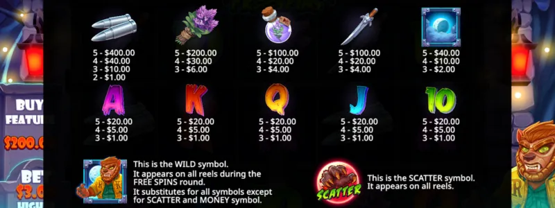 このゲームのワイルドシンボルは狼男で、スキャッターシンボルとマネーシンボル以外のすべてのシンボルの代替として機能します。